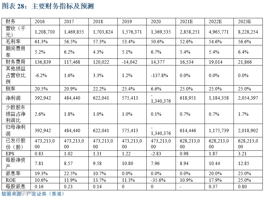 根据以上假设,我们预计2021-2023年,公司归母净利润将分别增长-145.8%、91.3%和71.7%至6.1亿元、11.8亿元和20.2亿元,EPS将分别增长-134.6%、91.3%和71.7%至0.98元、1.87元和3.21元。