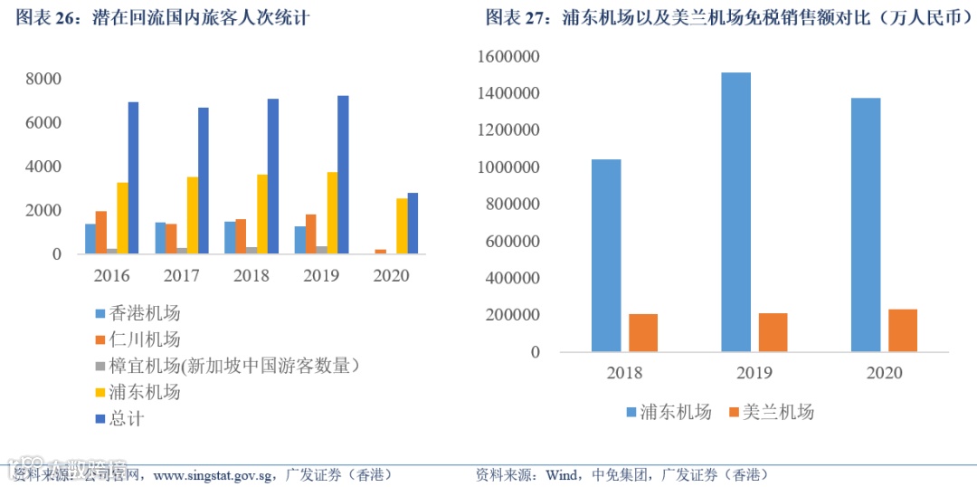 除浦东机场外,其余机场的中国游客约占20%,浦东机场在疫情发生前约占50%。除仁川机场2016-2017年受中韩关系恶化中国游客下降外,其余机场情况相对稳定。美兰机场国内游客占比高达95%,面向免税消费者主要为国内游客。