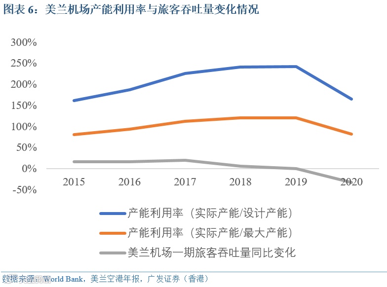 四大对标机场中中国游客人次总数在2019年为7265万。该群体将是公司努力争夺的市场,而最终能够吸引多少群体回流短期取决于全球疫情的进展(美兰机场事实上受益于目前的世界隔离政策)和免税政策红利释放的效果,长期仍取决于海南作为一个旅游目的地的相对吸引力。我们认为,美兰机场对于该群里的转换率的提升将会是一个漫长而缓慢的过程。不过,考虑到该群体的体量(超过7000万)和美兰机场平均旅客吞吐量以及二期工程建成后可容纳人次,即便转化率较低,也会对美兰机场客流量增长起到较大的促进作用。