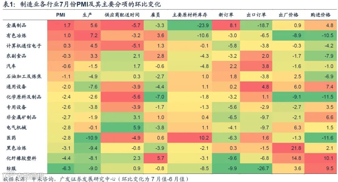 由于分行业PMI本身存在季节性特征,从各行业过去4年的环比规律来看,消费品行业的季节性特征较强,过去4年历史数据显示,汽车、纺服行业PMI均会在7月份出现明显下降,7月份汽车和纺服PMI环比分别下降0.6和6.3个百分点,而过去4年其环比均值分别为下降4和6.3个百分点。而其他行业的季节性规律并不稳定,在过去4年的同期的环比变化有降有升。