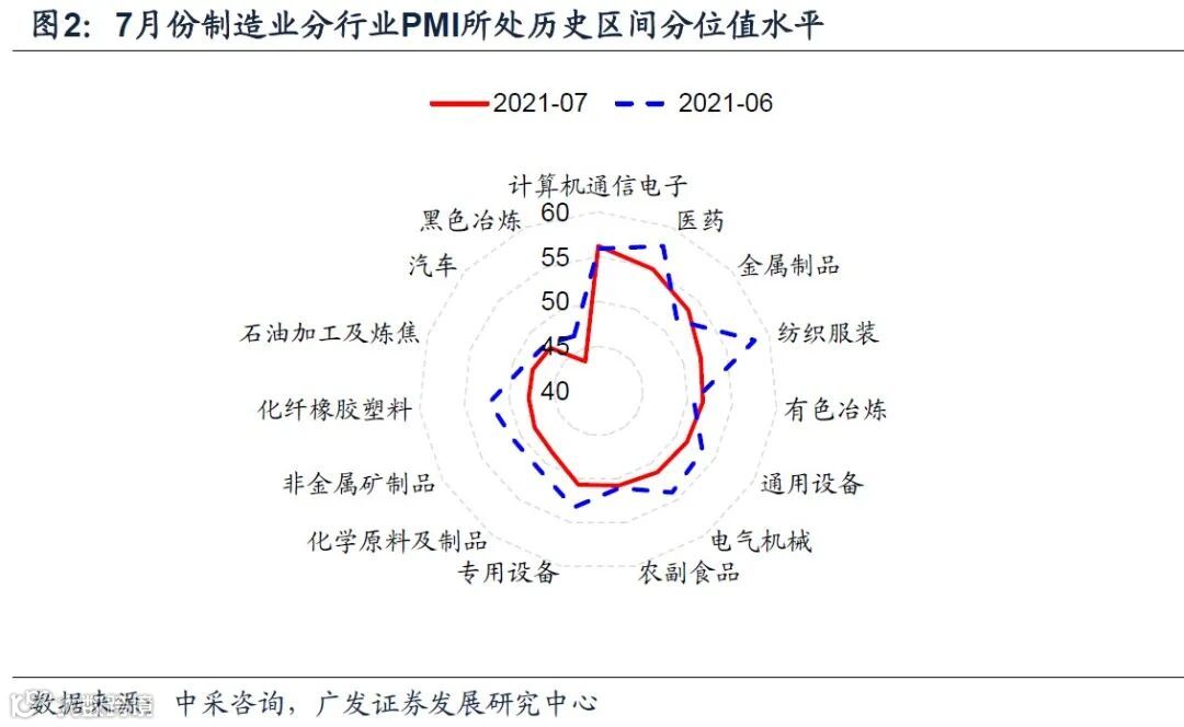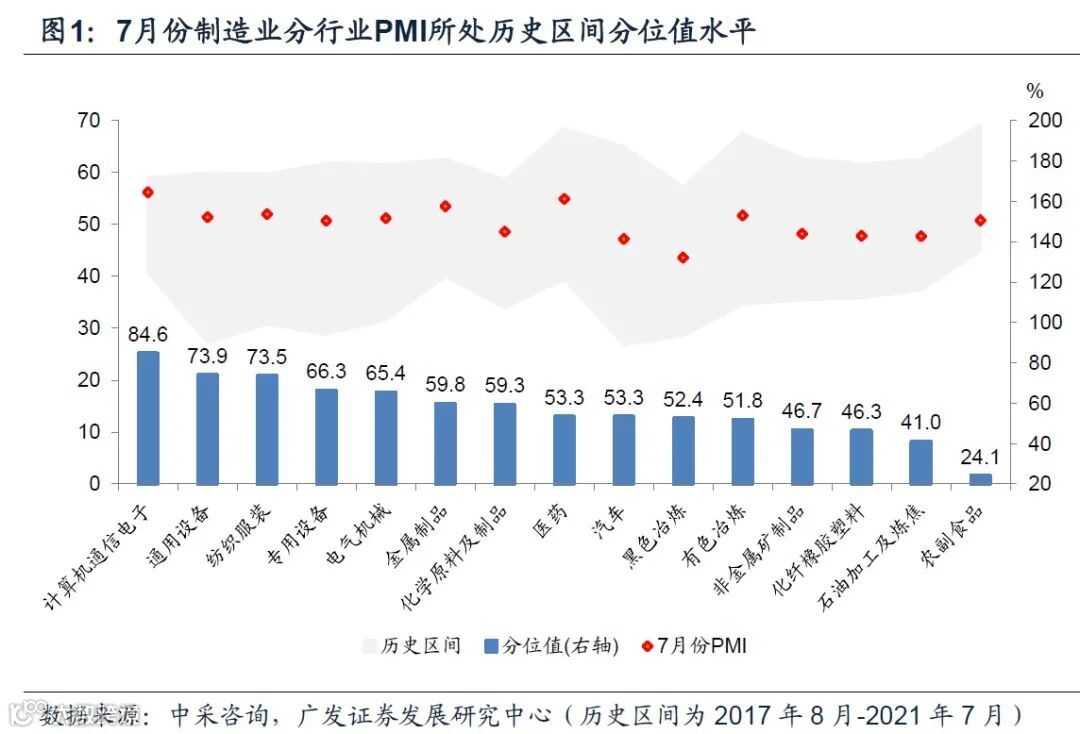 7月PMI绝对水平来看,位于扩张区间的行业个数从6月份的12个进一步降至9个,这9个行业按照景气度由高到低分别为:计算机通信电子、医药、金属制品、纺服、有色冶炼、通用设备、电气机械、农副食品和专用设备,其中,仅计算机通信电子行业景气度位于55以上的较高景气度区间。6个行业景气度位于50以下的收缩区间,景气度由低到高分别为:黑色冶炼、汽车、石油加工及炼焦、化纤橡胶塑料、非金属矿制品、化学原料及制品。