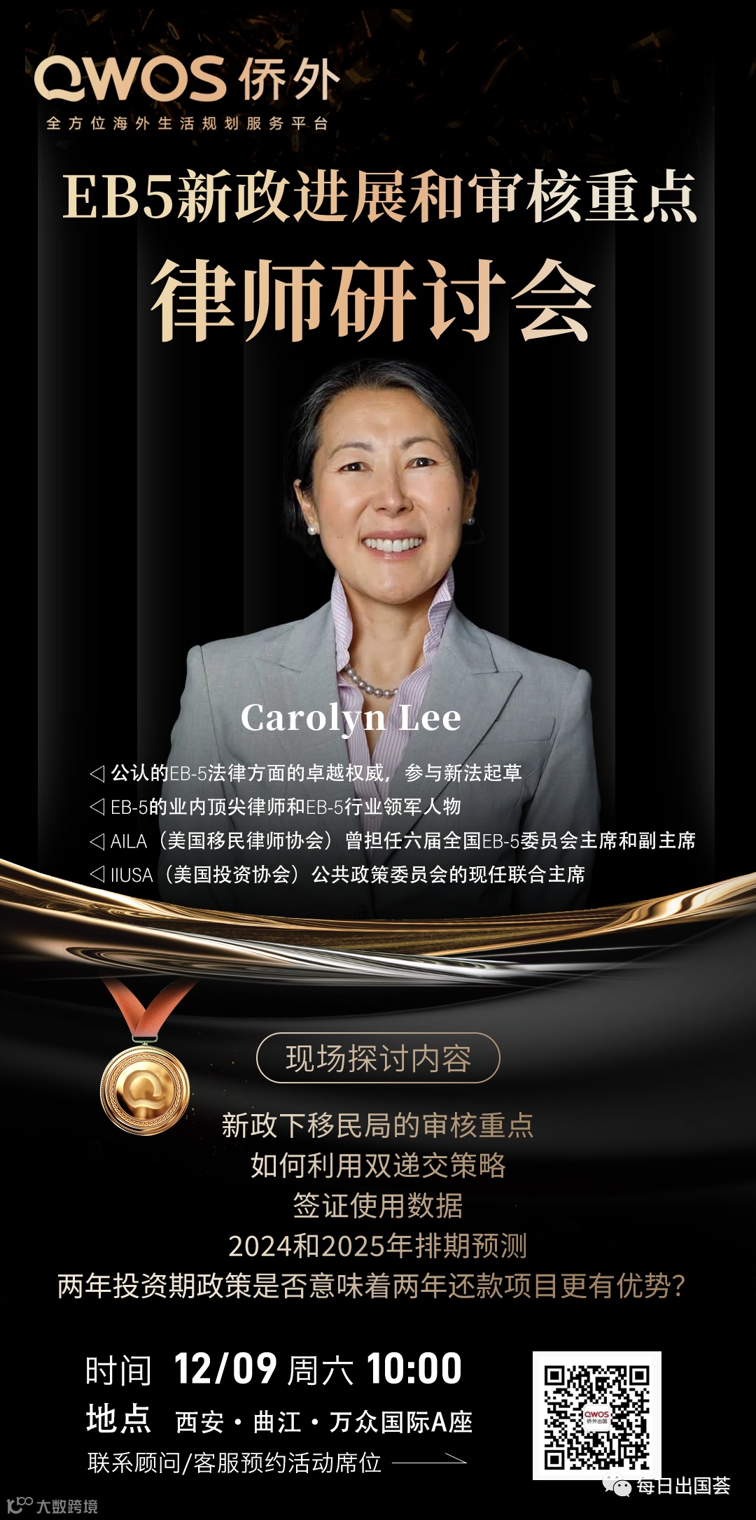 有兴趣的朋友,欢迎参加侨外出国12月9日在北京、上海、广州、深圳、西安等五个城市举办的EB-5活动,我们将邀请EB-5资深专家、律师Carolyn Lee女士详解投资者关注的EB-5排期预测、审核重点等内容,干货满满,大家千万不要错过哦!欢迎扫描下方海报中的二维码预约报名!