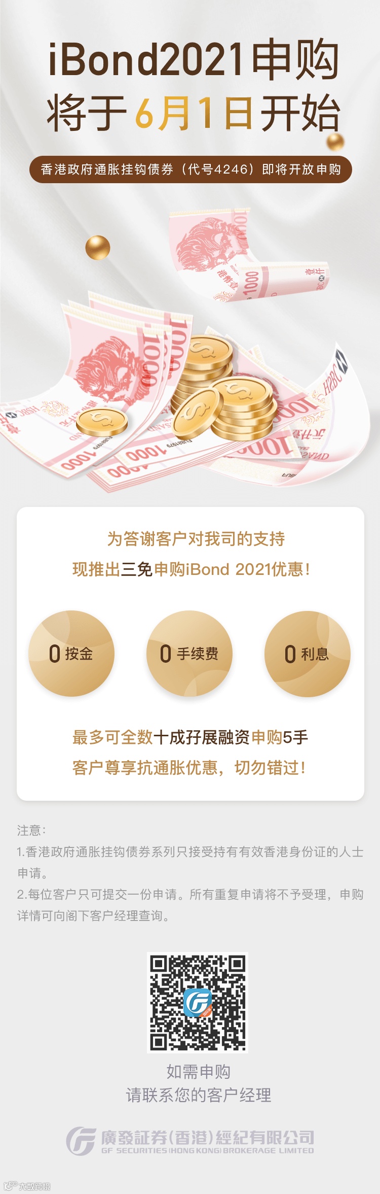 抗通胀债券来了!香港政府通胀挂钩债券iBond2021(代号4246)将于6月1日开始申购!我司推出“0按金”、“0手续费”、“0利息”三重优惠助力阁下申购!