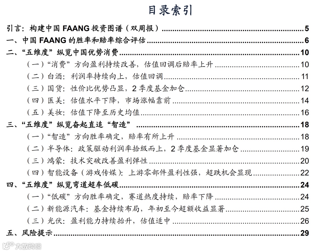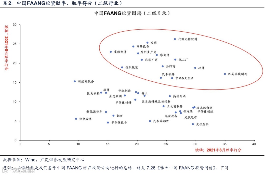 我们在6.16《从FAANG看A股“热门股”行情》指出,高质量发展政策牵引,A股利润率回升,“热门股”有望长牛,并构建了中国版FAANG投资图谱。今年A股高低景气赛道的分化加剧,而广义流动性结构性收紧,狭义流动性较为宽松,因此细分领域投资胜率为主,赔率为辅。本文将从胜率和赔率角度出发,综合盈利(预期)的变化/市场热度/估值/基金持仓/交易结构5个维度,对中国FAANG投资图谱进行双周度跟踪。●构建胜率综合评价体系。