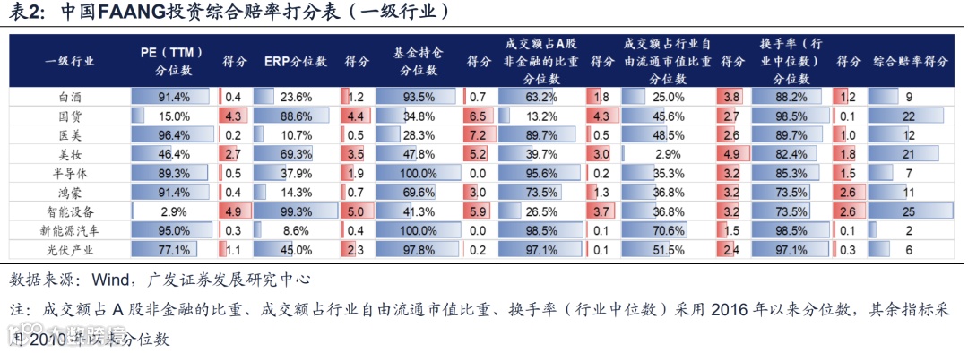 我们选取估值(PE和ERP,周度数据)的历史分位数、基金持仓(持仓比例的历史分位数,季度数据)、市场交易结构(成交额占A股非金融的比重和成交额占行业自由流通市值的比重,周度数据)以及市场交易热度(换手率的历史分位数,周度数据),对这些指标进行综合打分,构建FAANG的赔率跟踪体系。