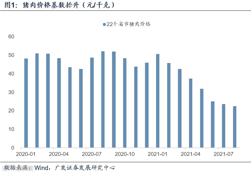 猪肉价格基数抬升是主要背景之一。以22省市猪肉价格为例,基数从去年7月的48.8元/千克上升至52.3元/千克。8月猪肉价格降幅收窄,但环比依然是-1.4%的负增长,基数抬升叠加环比走低,猪肉价格同比为下降为-44.9%。