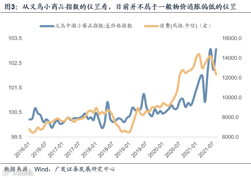 所以我们一直建议同时参考中微观指标观测一般物价,比如义乌小商品指数。2016年以来消费类资产(以中信风格指数消费观测)的走势大致同步于义乌小商品指数,可以侧面印证后一指标的有效性。从义乌小商品指数看,我们不能把目前宏观环境简单理解为一般物价低通胀。