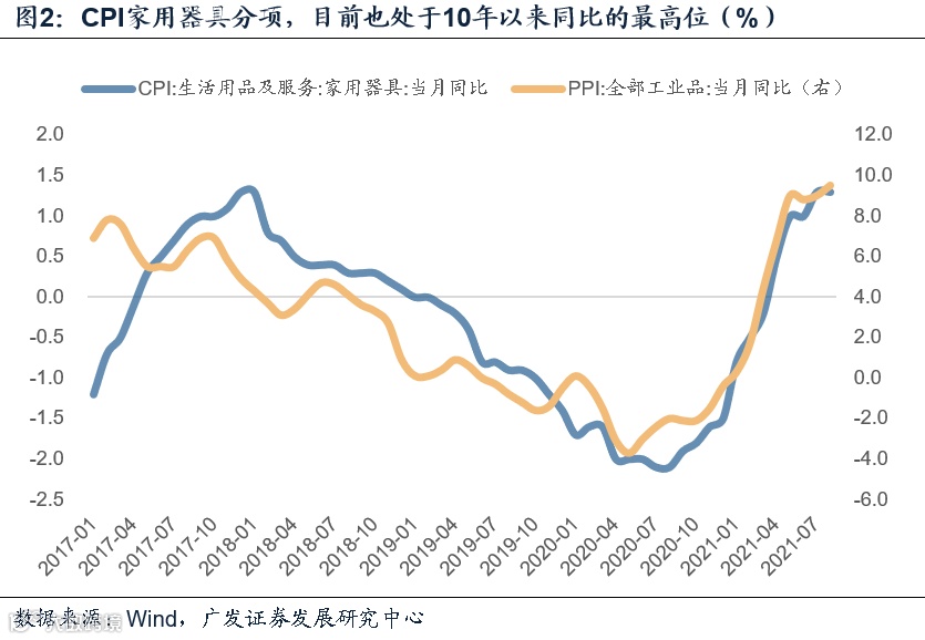 第二,高PPI有没有向CPI传导?实际上是有的,如果我们看“CPI家用器具”分项,它基本上和PPI维持着高度的相关性,目前位置也处于10年以来同比的最高位。但这一部分的权重和弹性不足以影响整体CPI。