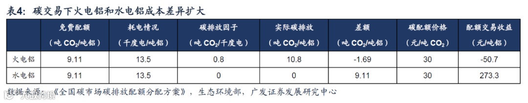 代入具体数据测算:若按照2017年公布的全国碳市场碳排放配额分配方案,电解铝行业配额=铝液产量×排放基准值(9.11tCO2/吨铝液),按每吨电解铝耗电13.5千度电、火电铝碳排放因子0.80吨CO2/千度电、碳配额每吨30元计算,可得碳交易为生产每吨火电铝和水电铝带来约324元的成本差异,且这一差异将随着碳配额价格提升进一步扩大。
