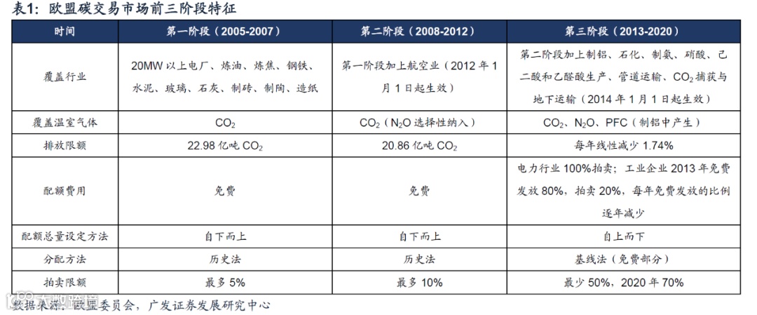 欧盟碳交易发展进程可以归纳为以下三个特点:(1)排放许可上限不断降低。第一、二阶段的排放许可上限分别为22.98亿吨/年和20.86亿吨/年,在一定期限内保持不变,第三阶段排放许可上限每年下降1.74%,逐年降低。(2)配额及储备方式趋严。配额方式从免费分配逐渐加入拍卖机制,在此过程中免费发放配额占总配额的比例从100%依次下降到90%/50%。(3)覆盖范围逐步扩大。随着欧盟碳交易市场的发展,涵盖气体从单纯的二氧化碳扩展至氧化亚氮、全氟化碳等温室气体;覆盖行业从能源、钢铁、水泥、造纸等行业逐渐增加航空、石油化工等行业。