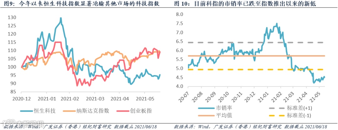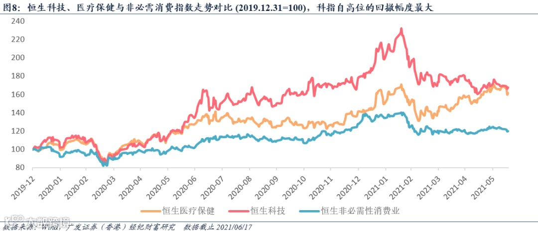 横向来看,在前期港股市场最受投资者青睐的“新经济三杰”(即科技、生物医药、新型消费)之中,科网股的调整幅度最大:恒生医疗保健指数受疫苗使用、三胎政策放开、医美热潮兴起、未盈利生物科技B类股和医疗器械等子板块的轮番带动,目前已经收复2月后的失地,重回历史高位。新型消费板块内部则出现了显著的分化,部分行业遭遇了凶猛的“杀估值”浪潮,如面临着较大的政策不确定性的子板块(如电子烟和教育),以及增长逻辑发生了不利改变/难以自洽的行业(如餐饮业)等;而部分优质稀缺的细分子板块(如运动服饰)则受益于多重利好而持续走强。因此,目前在港股的三大新经济板块之中,前期调整幅度大、尚未见明显反弹的科网股估值吸引力比较突出。