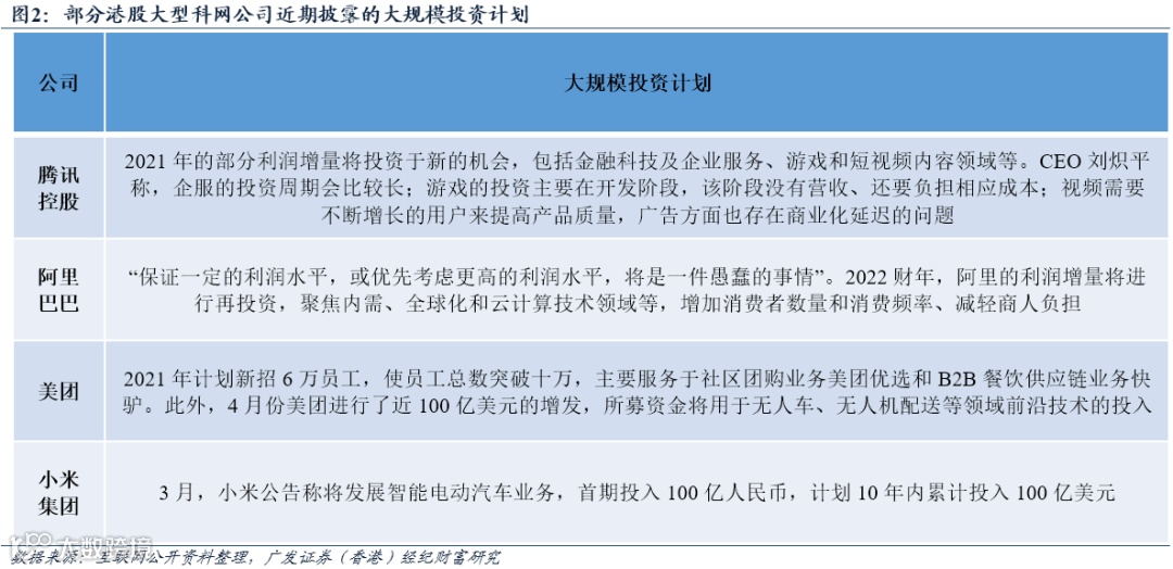 另一方面,反垄断也会促使科网巨企加大对竞争还不太激烈、“内卷程度”相对较低的新赛道的开拓,以寻求新的业务增长点——在近期的业绩会上,阿里和腾讯先后宣布会将利润的增量部分用于再投资,未来对业绩增长的重视程度将高于利润增长。总的来看,在中国科网行业普遍进入新一轮大规模投资期的背景下,短期内大型企业的Bottom Line利润端会受到压制,想象空间有限,也将影响整体的估值水平。