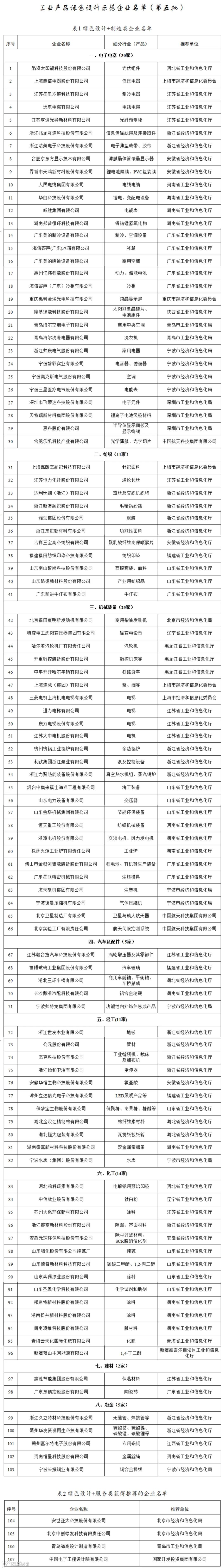 关于公布工业产品绿色设计示范企业名单(第五批)的通知