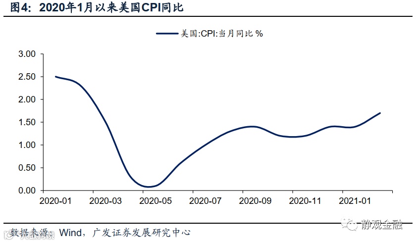 第三,4-5月可适度看多黄金:美国CPI同比将暂时跑赢10年期美债收益率。