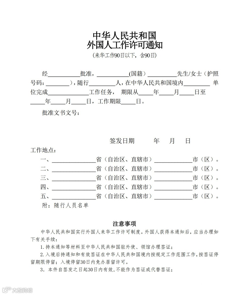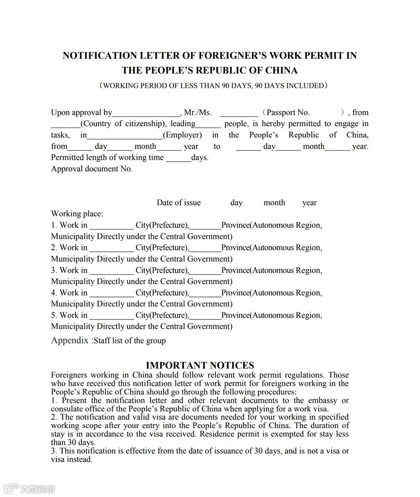 It should be noted that, the duration of stay shall not exceed 30 days, in which case the applicant shall enter the country with Z (occupation visa/or we call work visa) issued by the embassy, and leave the country before the expiration of the visa.The period of stay is more than 30 days but within 90 days (including 90 days). After entering the country with Z visa, the applicant shall be transferred to a work residence permit of the same duration as his short-term work permit, and then may stay and work within the valid period.