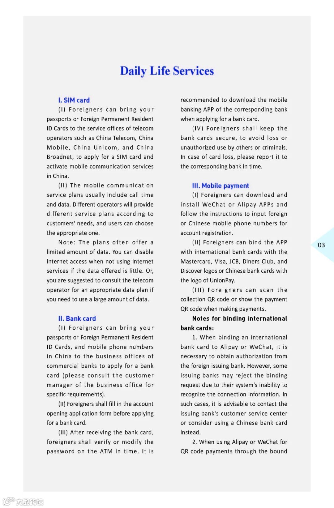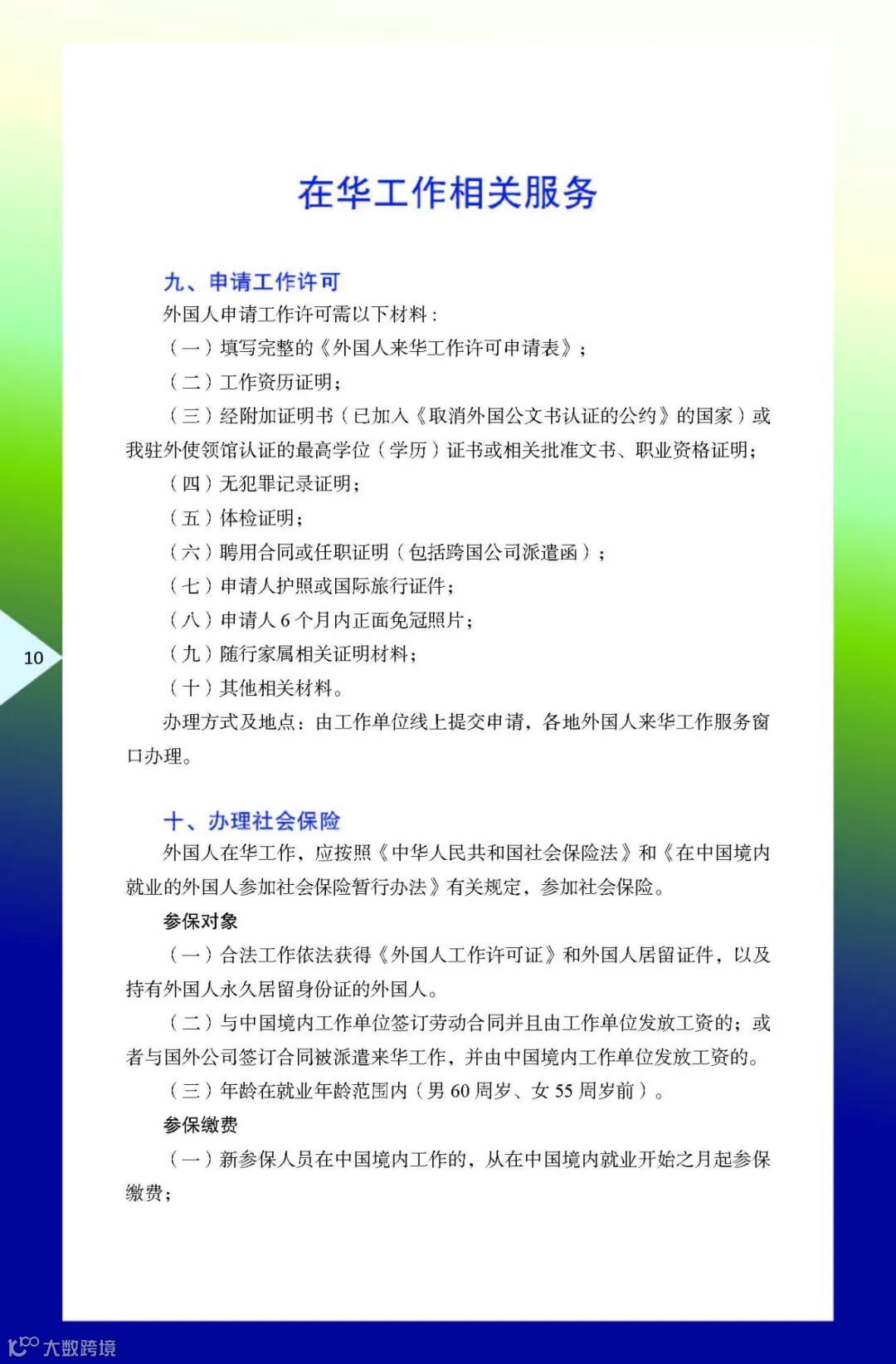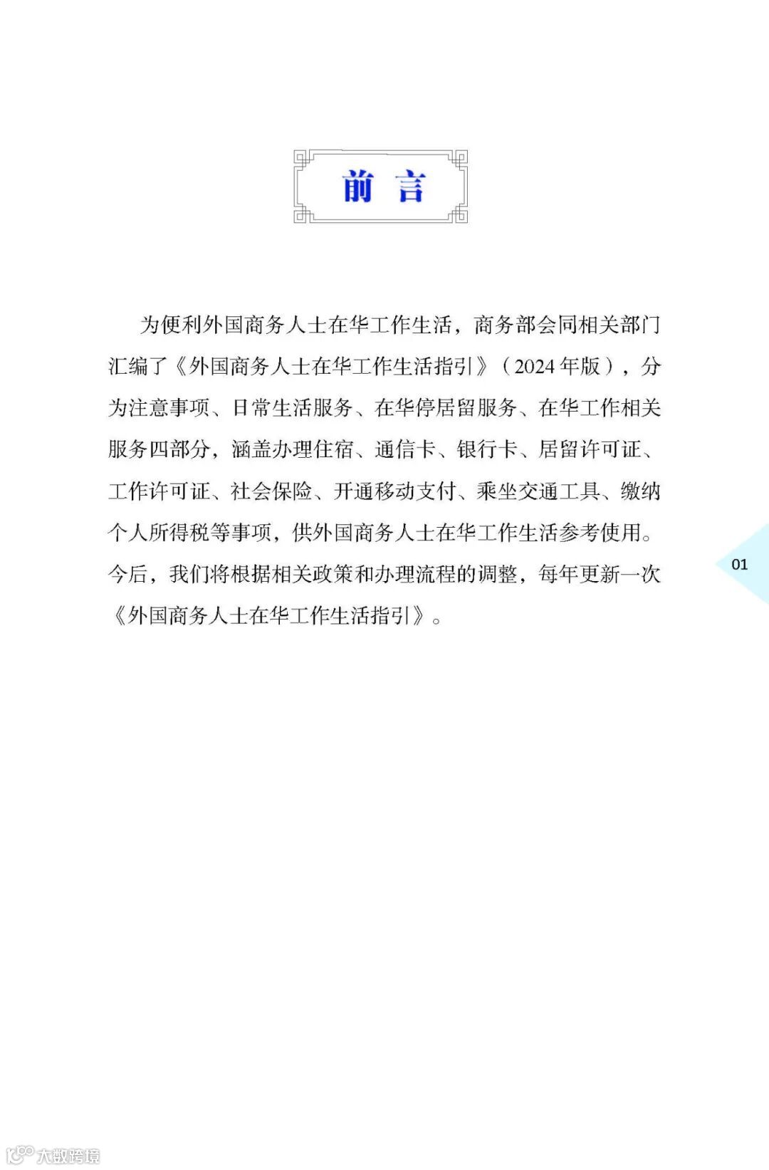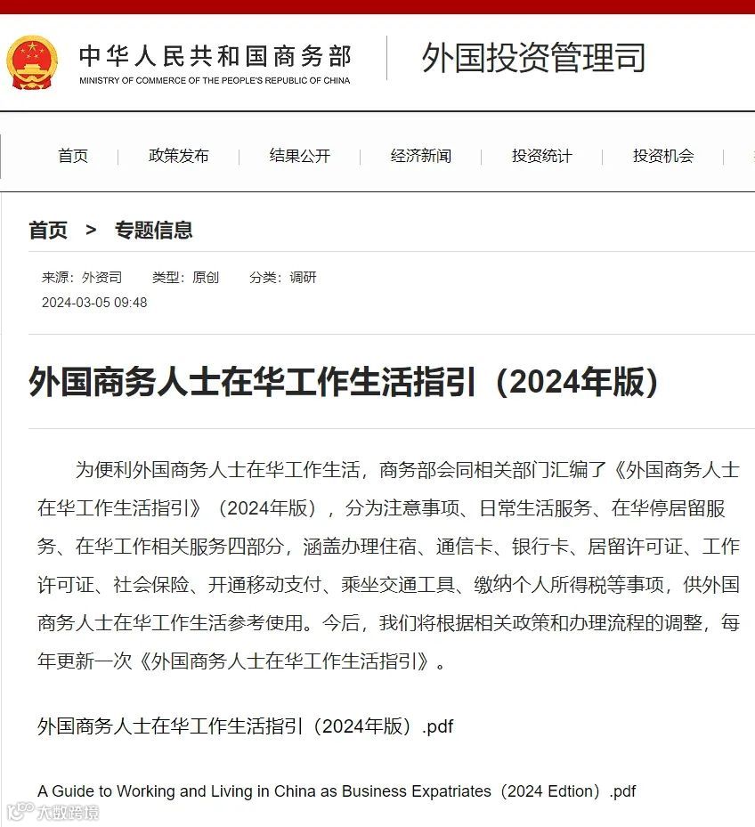 To facilitate foreign business expatriates working and living in China,the Ministry of Commerce of the People's Republic of China,in collaboration with relevant departments, has compiled A Guide to Working and Living in China as Business Expatriates (2024 Edition). It includes four parts, Notes,Daily Life Services, Services for Stay and Residence in China, and Relevant Services for Work in China, covering matters such as residence registration, SIM card, bank card, residence permit, work permit, social insurance, mobile payment, transportation, payment of individual income tax, and etc. We will update the Guidelines on an annual basis pursuant to changes in relevant policies and procedures.