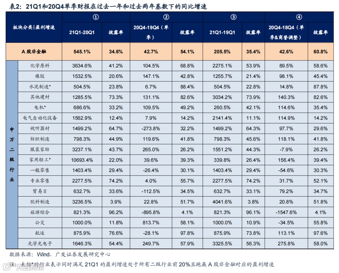 ● 如何在高增速中寻找真景气?低基数下,多数行业实现一季度高增长,为剔除基数干扰寻找真正高景气,我们将21Q1财报以20Q1和19Q1为基期,20Q4财报以19Q4和18Q4为基期计算同比(单季),并筛选在两个基期下一季报相对四季报均加速、一季报自身增速处于前20%的行业,主要集中于中游制造业的化学原料、橡胶、水泥、光学光电子;消费类的纺服、家用轻工;以及服务业的零售、旅游、航运。其中非服务业的行业分布与出口产业链的重合度较高。