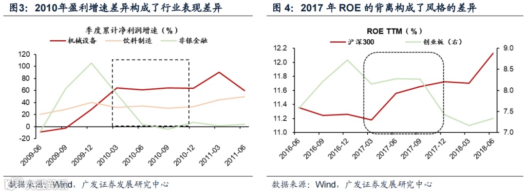 4. 相同点是逻辑改善的方向在过去两轮类似周期中均取得明显超额收益,本轮在“人少”的基础上仍应把握“逻辑改善”的方向。2010年3月-11月,盈利表现良好、景气度高位的机械设备、饮料制造、和受益于拉闸限电带来产品价格抬升、资产周转率改善的部分周期品表现较优。2017年3月-12月行情走势根据盈利分化,ROE持续上行的沪深300显著跑赢ROE持续下行的创业板指。盈利增速和ROE均稳定高位的白酒、白电、保险领涨,受环保限产推动的有色、钢铁、采掘亦取得阶段性较好表现。历史经验对于本轮仍具有借鉴意义,配置人少+逻辑改善的方向。