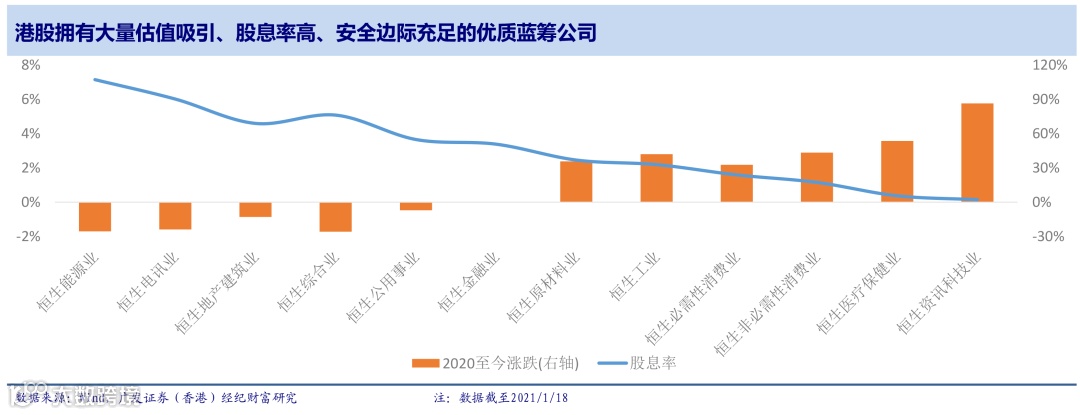 2020年A股出现了明显的“抱团取暖”现象,给予兼具确定性与成长性的龙头较高估值,使得目前市场上仍具备较高投资性价比的蓝筹股供给相对不足。恰逢公募基金在年初进行调仓、全民“炒基热”带来充足的弹药,配置的需求不断累积,而新基金的港股投资额度又被放宽至50%,因而大批资金便将目光投向了估值吸引、股息率高的港股市场。