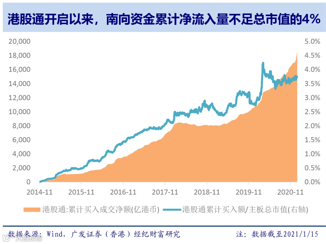 :2020全年,港股通日买入额/市场总成交额的中枢仅在10%;2014年底港股通开启至今累计的总买入额也只占港股总市值的3.7%。在去年3月港股跟随全球市场探底时,虽然南向资金仍持续买入支撑,彰显了良好的“兜底”作用、存量占比也一度攀升至4.5%,但其后随着大市回暖,比重又显著回落。