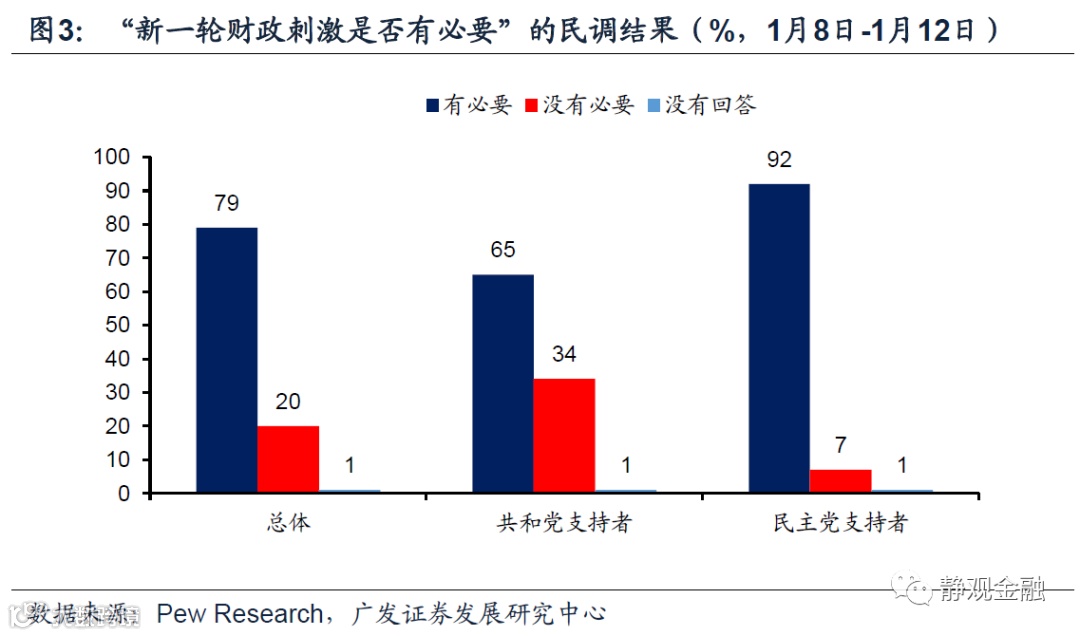 若民主党在财政刺激规模上做出让步,3月新一轮财政刺激落地概率仍高。2020年3月疫情暴发令两党快速达成共识推动第一轮财政刺激;12月财政刺激到期、政府面临关门风险、疫情反弹令两党达成8990亿美元第二轮财政刺激计划。实践证明,两党往往会在危难之际达成共识,但凡有缓和余地都可能继续博弈。往后看,今年3月第二轮财政刺激到期,而按目前疫苗接种速度评估Q2末美国仍难以实现群体免疫,因此假若拜登能够在刺激规模上做出让步,3月两党达成共识落地新一轮财政刺激的概率仍高。且如图3的民调所示,1月中旬两党支持者均表示仍需新一轮财政刺激。
