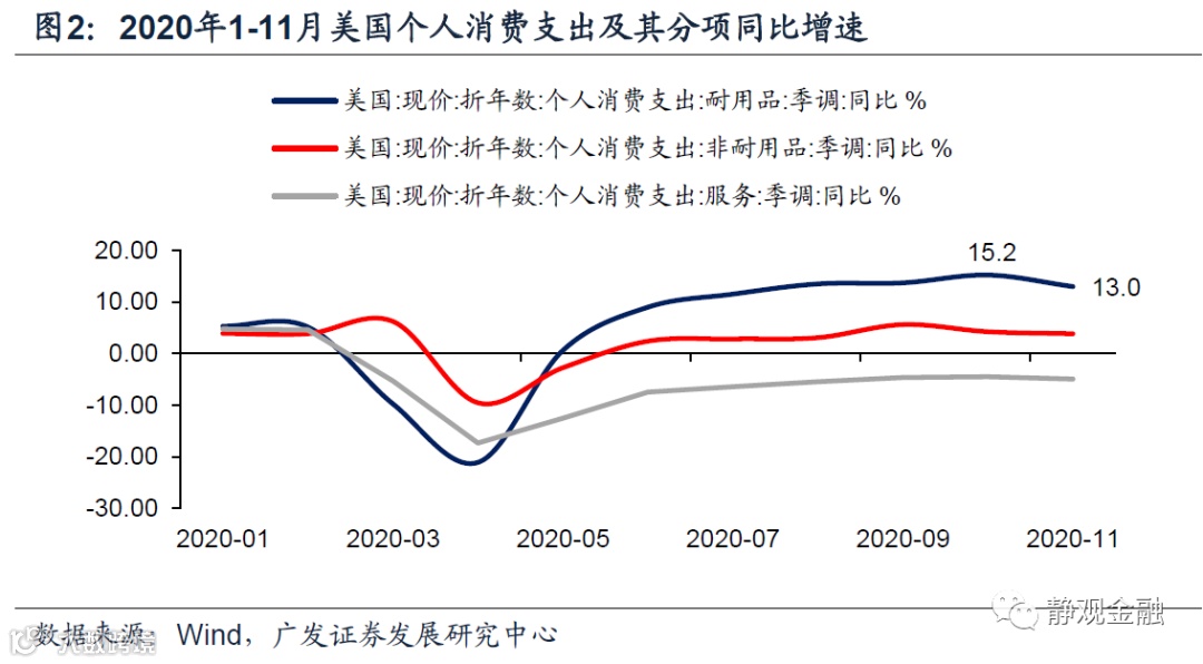 2020年12月疫情反弹后美国经济复苏势头确实有所放缓。如图1,2020年10月底到12月底(10-11月经济数据公布后)美国亚特兰大联储GDPNow模型不断上修Q4美国经济增长预期,而12月底至今(12月经济数据陆续公布后)则不断下修该预期。可见,疫情反弹、多国病毒变异以及疫苗接种不及预期等因素令12月美国经济增长放缓。此外,11月美个人服务支出同比增速为-4.9%,仍很疲软,且耐用品支出同比增速也有高位回落迹象。