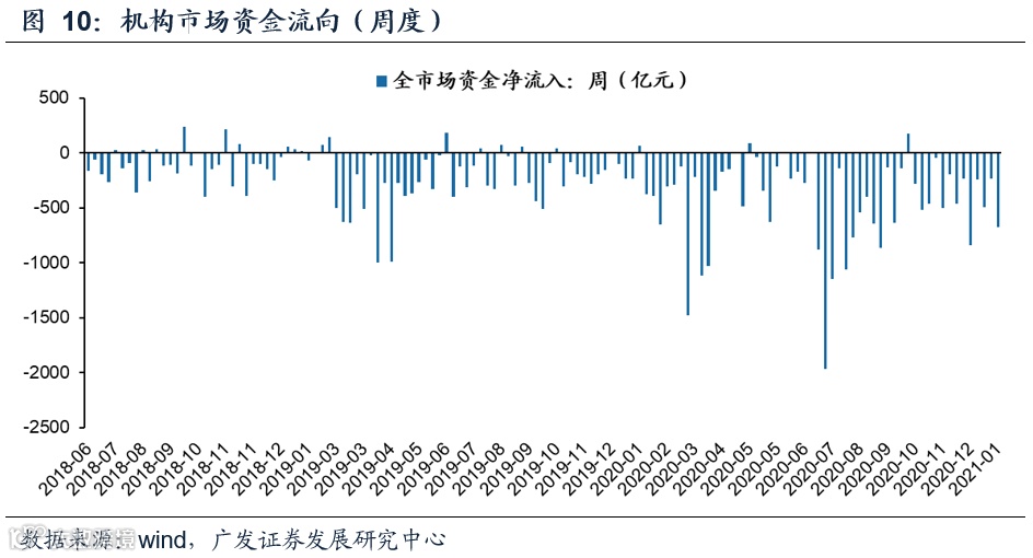 (5)陆港通北上资金流入净额:上周陆股通北上资金净流入191亿元,前一周净流入136亿元。截止2020年1月8日,2021年1月北上资金净流入191亿元,净流入前五名行业是化工、银行、非银金融、建筑材料、计算机,净流出行业前五名是食品饮料、电子、医药生物、通信、建筑装饰。