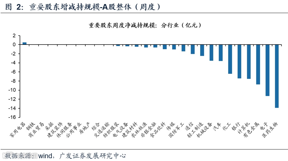 (2)重要股东增减持(A股整体): 本周重要股东减持72亿元,前一周净减持约101亿元。本周增持的行业为家用电器、钢铁,减持规模前三行业为医药生物、电子、有色金属。