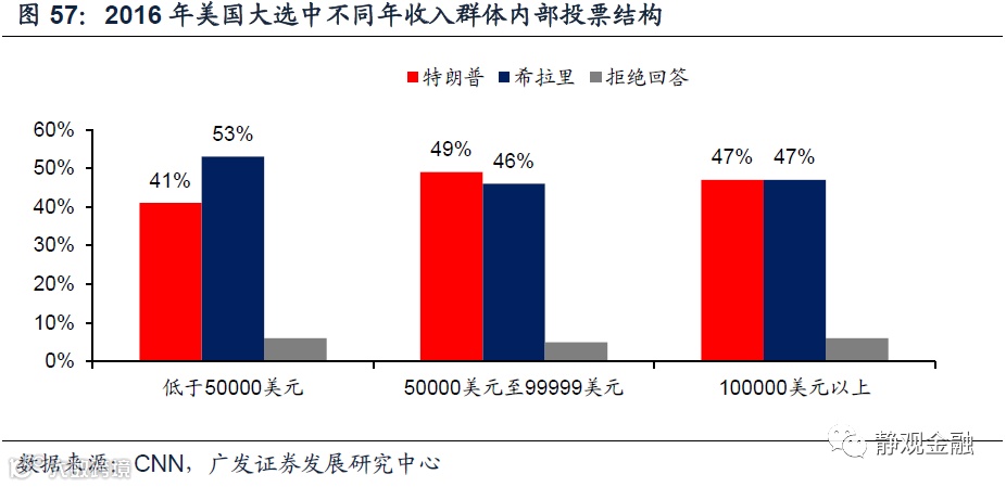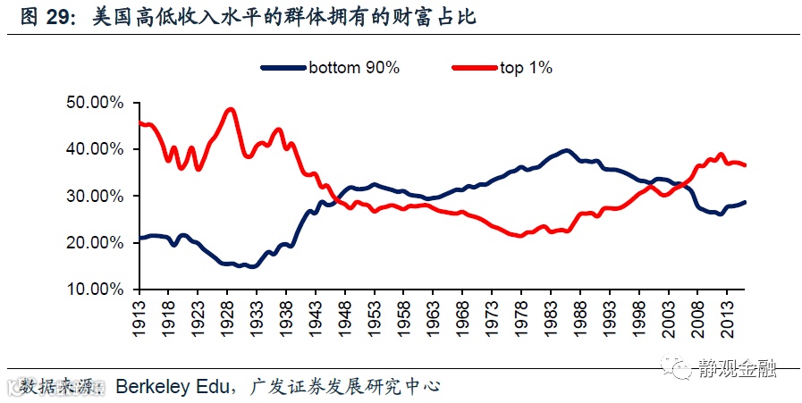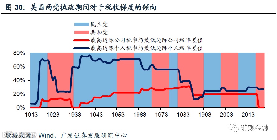 1. 二战后美国社会结构或为美国政治周期乃至无风险利率周期的内在驱动力民主党代表公平,共和党代表效率;社会结构驱动两党影响力交替。民主党是通过加税、劫富济贫来推动社会结构的优化,而共和党是通过减税、让政府和穷人补贴富人的方式推动资本逐利、效率的提高。因此,当美国贫富分化极端、中产占比很低的时候,社会矛盾就会推动整个社会去追求公平,那么民主党的影响力就会上升,以大萧条结束后1932年罗斯福当选为标志性事件;但是一旦整个社会结构非常优化、又会重新选择效率,美国将进入共和党影响力上升阶段,以80年里根当选为标志性事件。