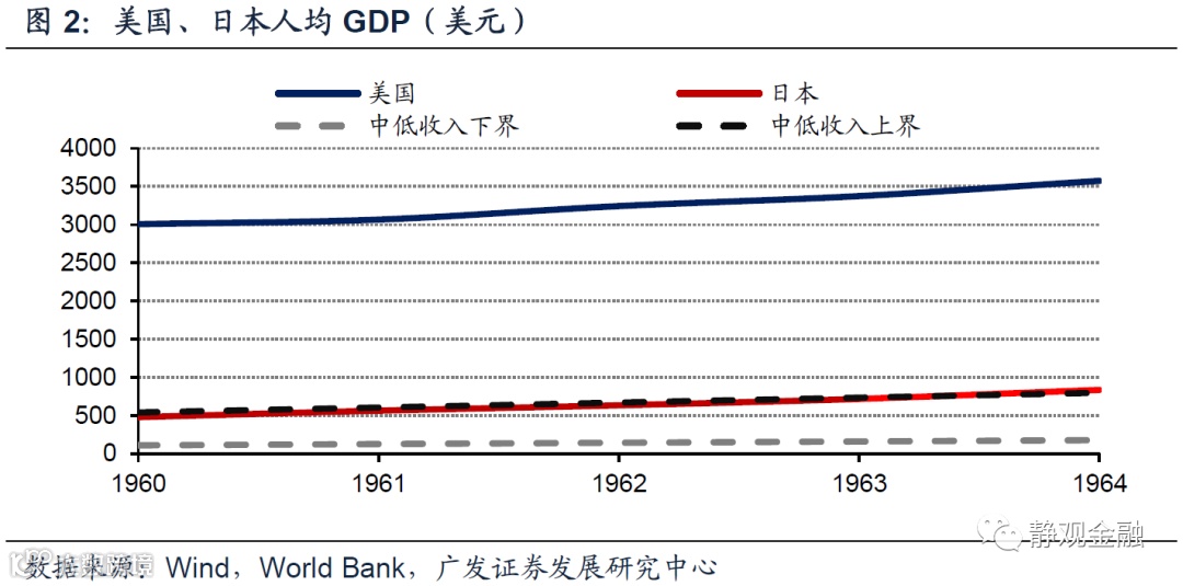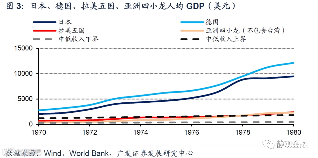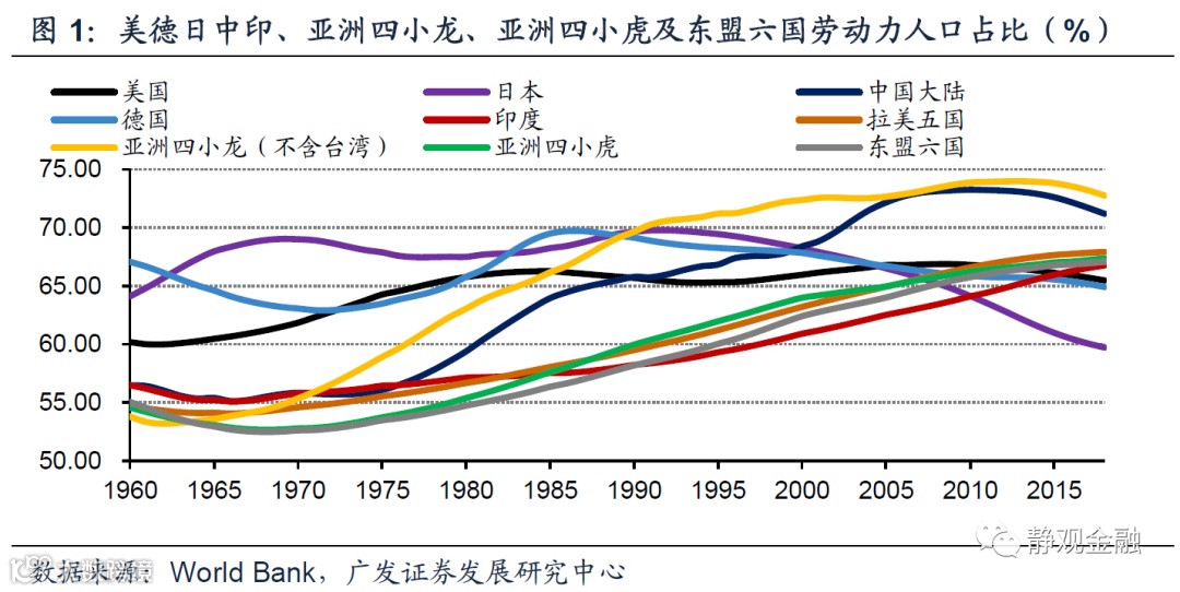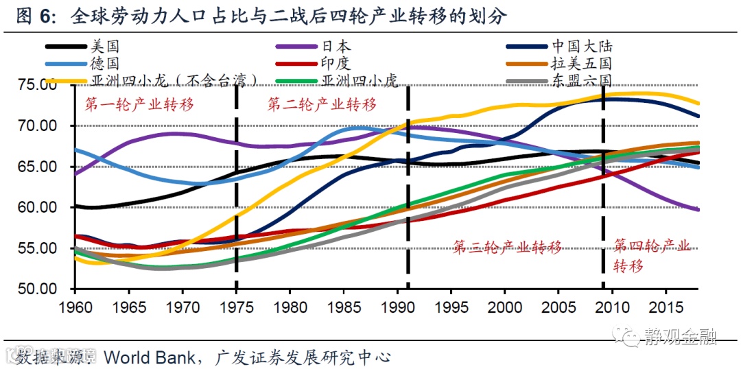产业转移的基础是人口结构与人力成本。60年代的日德、70-80年代的亚洲四小龙、90年代-金融危机前的中国以及金融危机后的东盟六国[1],每个产业承接国(经济体)在其承接中低端产业的过程中总会有相当长的时间劳动力人口占比明显高于60%、甚至高于65%。此外,根据世界银行的标准(我们线性估计了1960-1986年的情况)可知,60年代的日本、70-80年代的亚洲四小龙、90年代-金融危机前的中国以及金融危机后的东盟六国作为承接国时均为中低收入国家。可见,每一轮产业转移都是中高收入或高收入国家将其中低端产业向具有丰富劳动力资源的中低收入国家(而非低收入国家,以确保有一定工业基础)转移,令后者扮演全球“资源国—生产国—消费国”链条中生产国角色的过程。