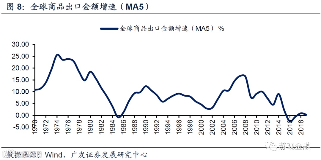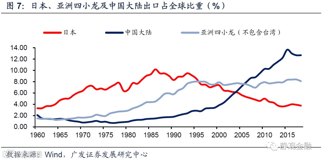 不可否认,过去几十年间由美国等发达经济体推动的全球贸易政策对产业转移产生了一定的影响。比如,1985年《广场协议》后日元大幅升值令日本人力成本大幅攀升并导致日本对外产业转移加速;1993年美国推动了北美自由贸易协定、1994年关贸总协定被更名为WTO;2001年中国正式加入WTO。由图7-8可知,1985年后日本出口份额占比开始下滑、亚洲四小龙出口份额大幅提升,与此同时全球商品出口增速亦触底回升;2001年中国加入世贸组织,随后中国出口份额加速攀升、全球商品出口金额增速也再度触底回升。相反,上世纪70-80年代美日贸易摩擦,此间全球商品出口增速也受到该因素掣肘;2018年美国对华贸易保护,2019年全球贸易活跃度也有所回落。