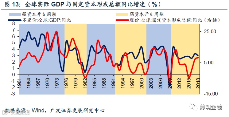 60年代以来全球出现了6轮资本开支周期:60年代、70年代、80年代、90年代、2001-2008年以及金融危机以来。正如全球固定资本形成数据所示,每一轮产业转移的上半场(70年代、90年代以及金融危机以来)该指标中枢都出现了下移,每一轮产业转移的下半场(60年代、80年代和2001-2008年)该指标中枢都出现了抬升。换言之,每一轮产业转移上半场都是弱资本开支周期、下半场都是强资本开支周期。