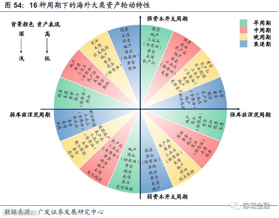 周期切换过程的大类资产轮动有四点规律:第一,各周期组合下领涨资产各有不同,表现出一定轮动特征。第二,不同小周期下的各类资产表现(见图54)具有连续性,表明该框架具有极好的容错率,即便小周期判断存在失误也不会导致投资组合相对收益过低。第三,弱资本开支周期对应强美元、美股表现强劲;强资本开支周期对应弱美元、美股表现相对偏弱。第四,从长期来看,股票是相对收益最高的大类资产。