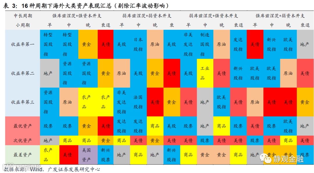 数据回溯得到如表3所示的16种经济周期下海外各类资产轮动规律: