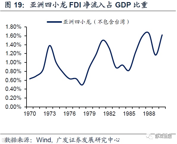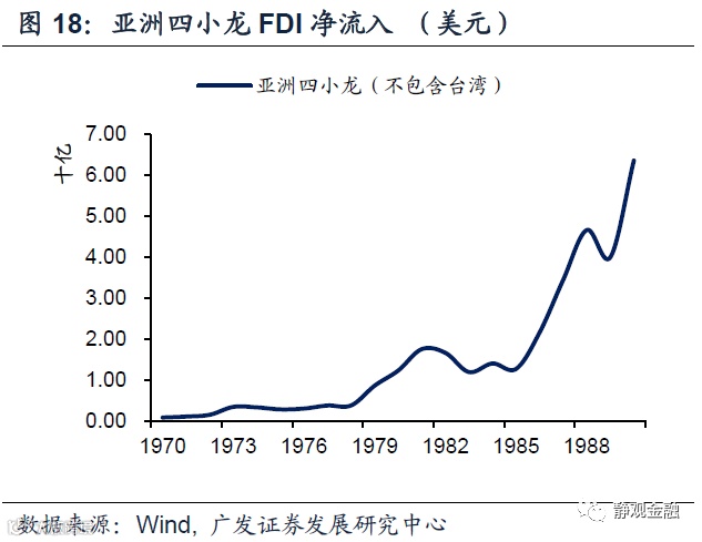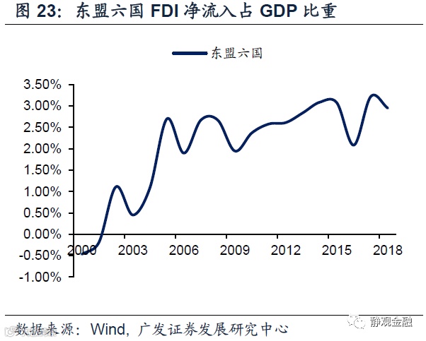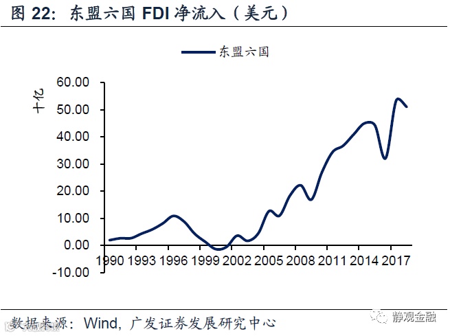 此外,我们观察到产业转移的启动往往发生在全球经济衰退后,比如第一次石油危机后发生二战后的第二轮产业转移(承接国为亚洲四小龙)、1991年后发生二战后第三轮产业转移(承接国为中国大陆)、金融危机后发生二战后第四轮产业转移(承接国为东盟六国)。其原因在于产业链本身具有一定粘性,即便国际资本能找到更低人力成本的经济体也未必立即下定决心进行产业转移,而经济衰退的过程往往引发企业优胜劣汰并容易推动大型跨国企业在更低成本环境中投资新产能进而也顺便推动了产业转移。