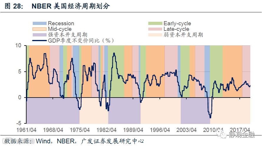 根据美国经济研究局(NBER)对于美国经济扩张、收缩和衰退的定义,我们利用实际GDP同比增速、美国失业率、时薪增速再适当结合CPI同比增速将美国经济划分为:早周期(Early-Cycle)、中周期(Mid-Cycle)、晚周期(Late-Cycle)和衰退期(Recession)。需要强调的是,有别于产业转移下库兹涅茨周期与资本开支周期的内生性及客观性,这种小周期的划分有时会存在主观性或者滞后性,因此可能在实操中出现一定误差。