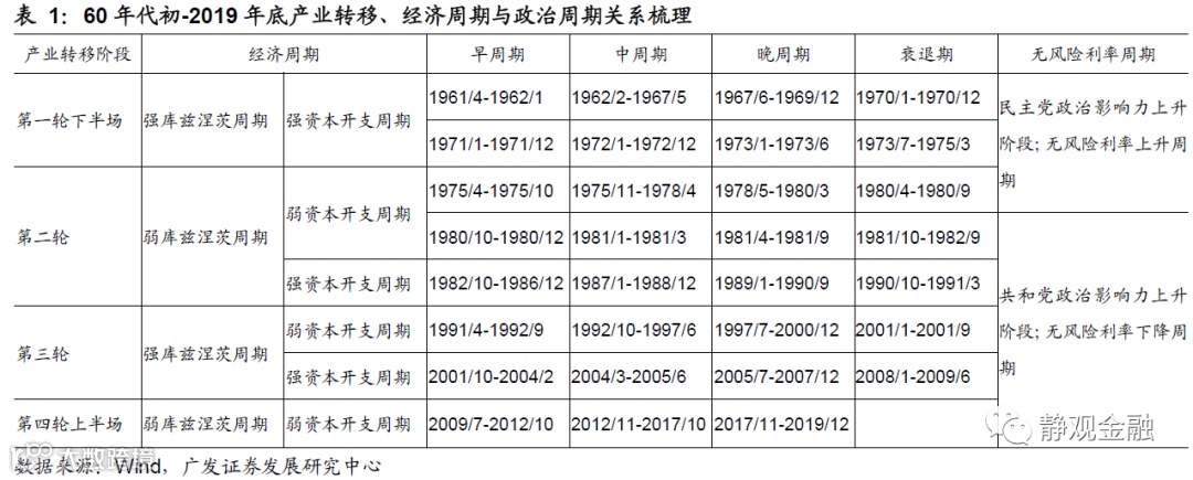 依据前文,我们将二战后四轮产业转移(库兹涅茨周期)的结束时点划分如下:第一轮库兹涅茨周期结束时点为1975年3月,第二轮库兹涅茨周期结束时点为1991年3月,第三轮库兹涅茨周期结束时点为2009年6月,第四轮库兹涅茨周期刚刚过半。结合全球实际GDP和固定资本形成总额进一步划分资本开支周期。每一轮库兹涅茨周期中嵌套两轮资本开支周期相当于一轮产业转移中包含上下两个半场。具体请见表1。