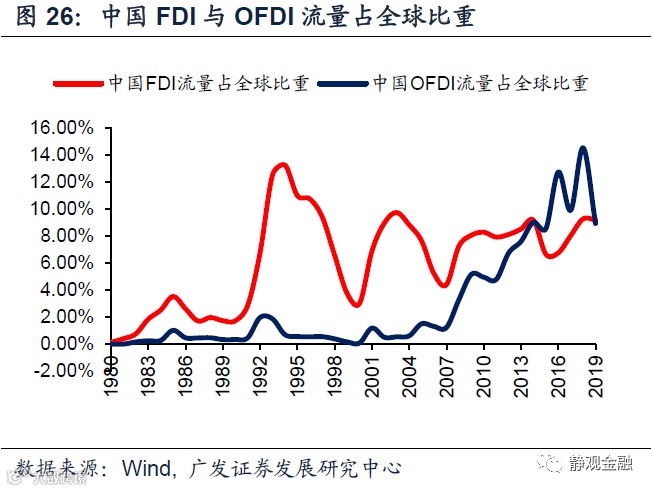 尽管产业转移属于全球经济的内生性变化,驱动力来自人力成本和人口结构,但这两个指标属于慢变量,很难由此判断每一轮产业转移的起止。但不难理解,一旦出现产业转移必然是国际资本先行,因此FDI(外商直接投资)的“异常”变化往往是产业转移发生的信号。当然FDI的“异动”体现为产业转入国FDI及其占GDP比重的大幅攀升以及产业转出国OFDI(对外直接投资)占全球比重全面超越FDI占比。