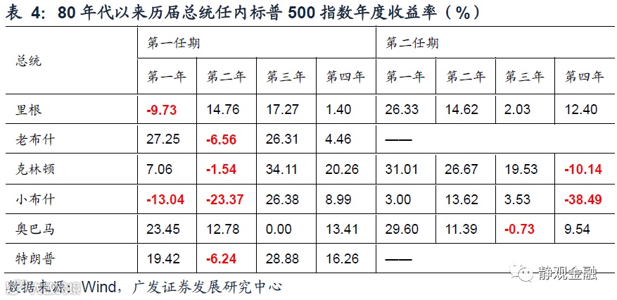 此外,美股“政治周期”亦表明今明两年美股调整几率较高。如表4所示,尽管美股涨多跌少,但每位总统上任前两年美股下跌几率极高,这与内政基调切换、资本市场有所不适等因素有关。一旦下半年美股调整,就很可能意味着美国科技牛市正式落幕。而在社会结构改善、消费力增强后,美股风格将切换至消费,类似60-70年代,而中间青黄不接之际,美国地产将好于股票、中国A股也将跑赢美股。