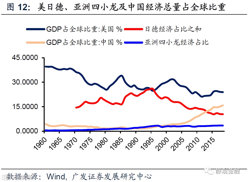 但是每一轮产业转移承接国的经济体量存在差异。当承接国为大型经济体时,全球经济就会受到一轮强库兹涅茨周期拉动,比如50-60年代和90年代到金融危机前后;若承接国为小型经济体,全球经济就与一轮弱库兹涅茨周期共振,比如70-80年代。