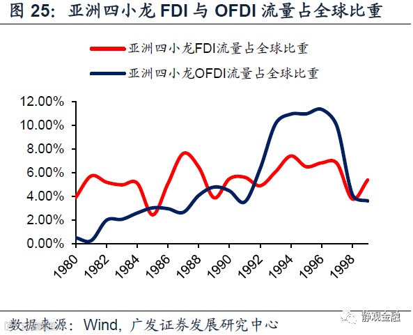FDI异动为国际资本先行信号。人力成本和人口结构属于慢变量,很难由此判断每一轮产业转移的起止时点。一旦出现产业转移必然是国际资本先行,FDI的“异常”变化往往是产业转移发生的信号,体现为产业转入国FDI及其占GDP比重的大幅攀升以及产业转出国OFDI(对外直接投资)占全球比重全面超越FDI占比。