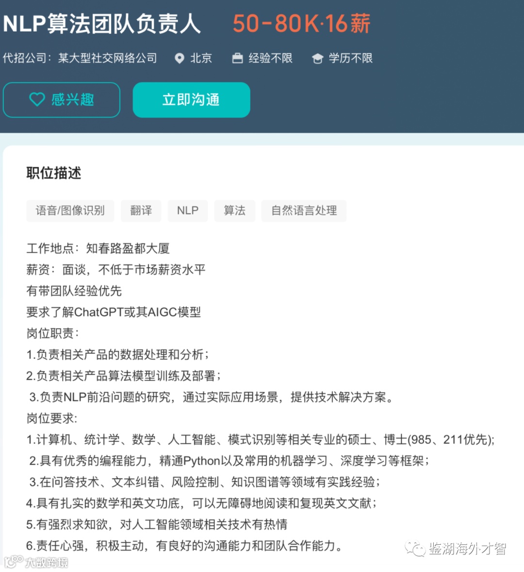 在招聘网站上,不少企业均将了解ChatGPT运行机制作为AI工程师的必备条件。某大型社交网络公司则开出了“50K-80K·16薪”的优厚条件,招聘NLP(自然语言处理)算法团队负责人,并要求“了解ChatGPT或其AIGC(AI生成内容)模型”,并“负责NLP前沿问题的研究,通过实际应用场景,提供技术解决方案”。