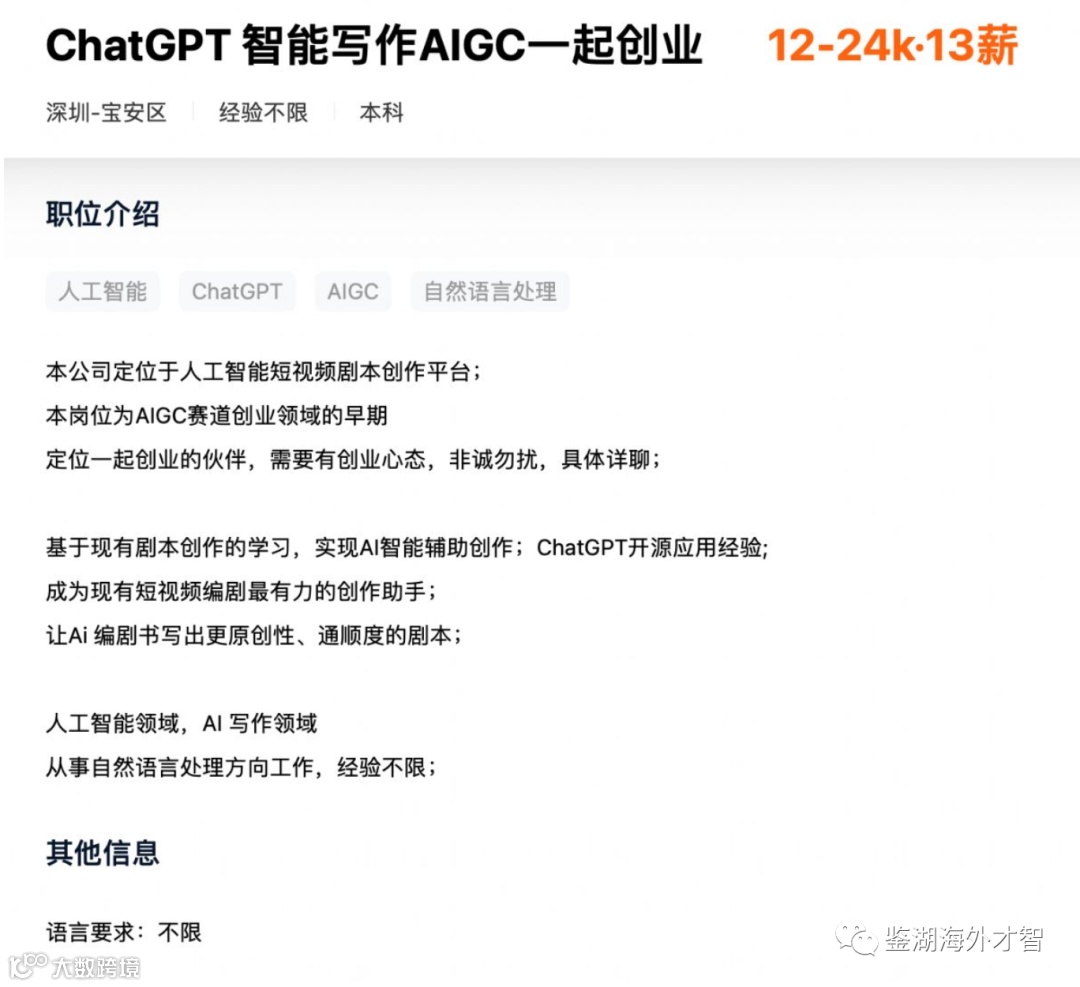 除了科技企业外,也有不少新兴产业前来“蹭热度”。招聘网站显示,深圳某企业正在招聘从事自然语言处理方向工作的创业伙伴,该公司定位为“人工智能短视频剧本创作平台”,并表示将通过AI智能辅助创作,成为现有短视频编剧最有力的创作助手,“让AI编剧写出更有原创性、通顺度的剧本”。