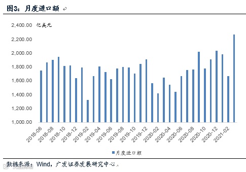 3月进口额为2273亿美元,进口同比增速为38.1%,去年同期同比增速为-1.4%。