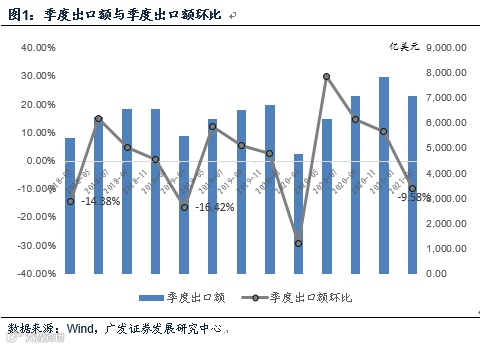 第一,3月出口维持强势表现,同比增长达30.6%,即使考虑基数这一增速也显著偏高。2411亿美元的绝对值也是历史第四高点。今年一季度环比去年四季度的降幅显著好于正常季节性(图)。这一积极表现具有同步性,同期主要新兴制造业国家的出口均表现较好,3月韩国出口、越南出口同比增速分别为16.6%、43.0%。