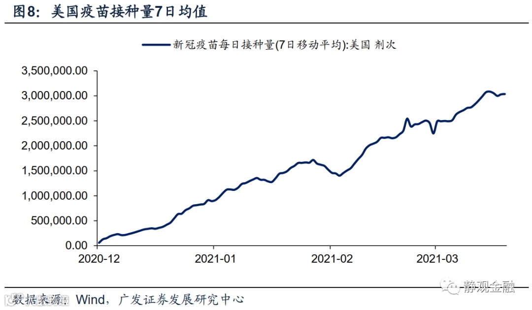 我们多次强调美联储QE政策的主要意图就是在国债供给量较大的阶段帮助政府压低美债发行成本。一方面,第三轮财政刺激就是最后一轮抗疫刺激;另一方面,拜登基建及加税绑定的新政并不会给2021H2及此后的美国政府带来极大的赤字压力。因此,只要实现群体免疫,美联储就可以顺势削减QE、回收冗余的流动性了。目前美国完成疫苗接种的人数占比已经达到26.5%且每天疫苗接种平均人次也在300万左右,Q2末至Q3初基本完成群体免疫将是大概率事件。届时美国经济的系统性风险解除并且也将迎来报复性服务消费及资本开支,经济总量也将回到疫前水平,这也是美联储削减QE的必要条件。