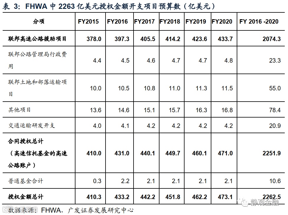 拜登基建并非是新鲜事,奥巴马任期也曾推动过基建政策。奥巴马时期的《修复美国地面交通运输法案》(Fixing America'sSurface Transportation Act,FAST)是美国近十年来首次通过的长期授权法案,重点是修缮高速公路及货运设施。该法案在国会获得了极大的支持,2015年12月3日以众议院359–65票、参议院83–16票在国会通过,总统签署生效后该法案为2016-2020财年的基础设施建设投资提供了3050亿美元拨款。其中,2263亿美元拨款给联邦公路管理局(Federal HighwayAdministration,FHWA)用于道路、桥梁、自行车和步道的改善项目,为该法案最大组成部分,其余787亿美元拨款给联邦交通运输局、联邦铁路管理局等部门。2020年10月1日特朗普决定将《FAST法案》延期一年至2021财年结束,规模为272亿美元。