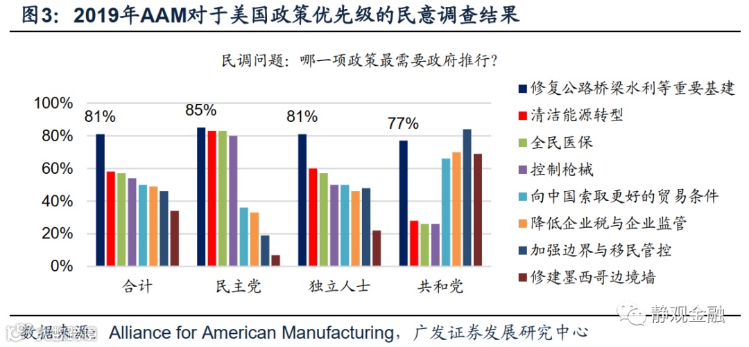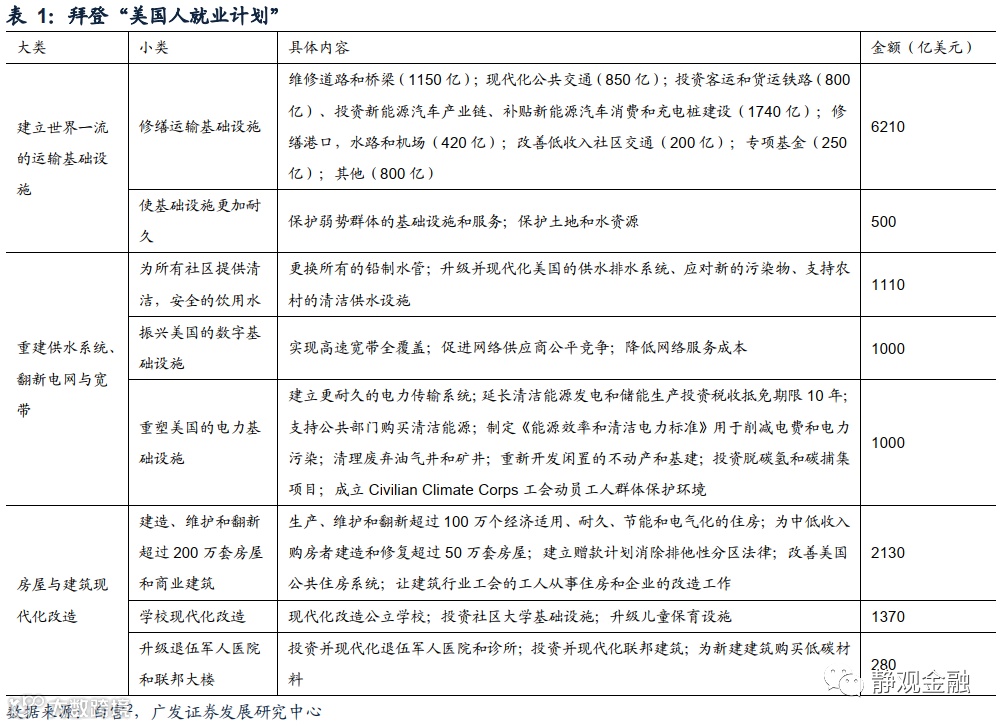 第二,拜登就业计划强调基建、制造业和雇员权利。“美国人就业计划”主要有三个看点:强调基建、制造业和雇员权利,淡化气候变化相关内容。基建支出为该计划支出的最大组成部分,呼吁联邦政府投资6210亿美元用于修缮运输基础设施、500亿美元用于增强基础设施耐久性、3110亿美元重建供水系统并翻新电网与宽带、3780亿美元用于房屋和建筑的现代化改造以及涉及4000亿的“社会基础设施建设”以扩大社区家庭护理工作机会以及薪酬。此外,该计划呼吁投入3000亿美元用于振兴本土制造业并在几乎每一章节都强调工人与工会的权利、要求所有受益雇主严格遵守劳工标准。