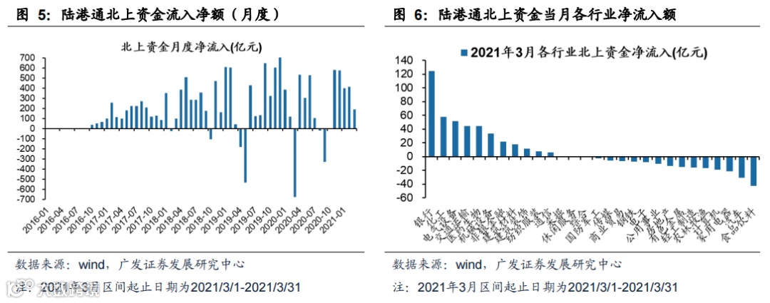 2021年3月(截至3月31日)北上资金净流入187亿元。净流入前五名行业是银行、化工、电气设备、交通运输、医药生物,净流出行业前五名是食品饮料、汽车、家用电器、计算机、农林牧渔。