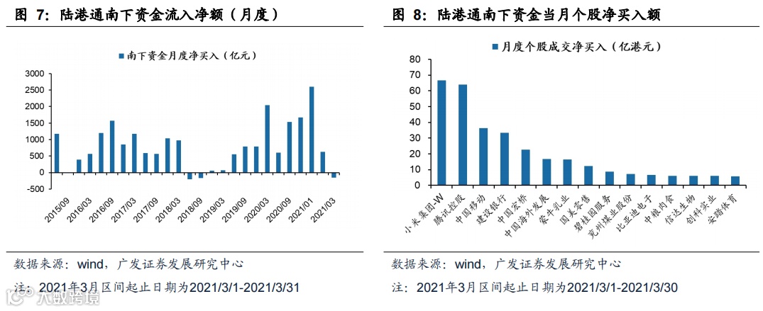 2021年3月(截止3月31日),南下资金净流出117亿元。净买入个股前五为小米集团-W、腾讯控股、中国移动、建设银行、中国宏桥。恒生一级行业净买入前三名为电讯业、必需性消费、地产建筑业,恒生二级行业净买入前三的行业为资讯科技器材、电讯、专业零售。
